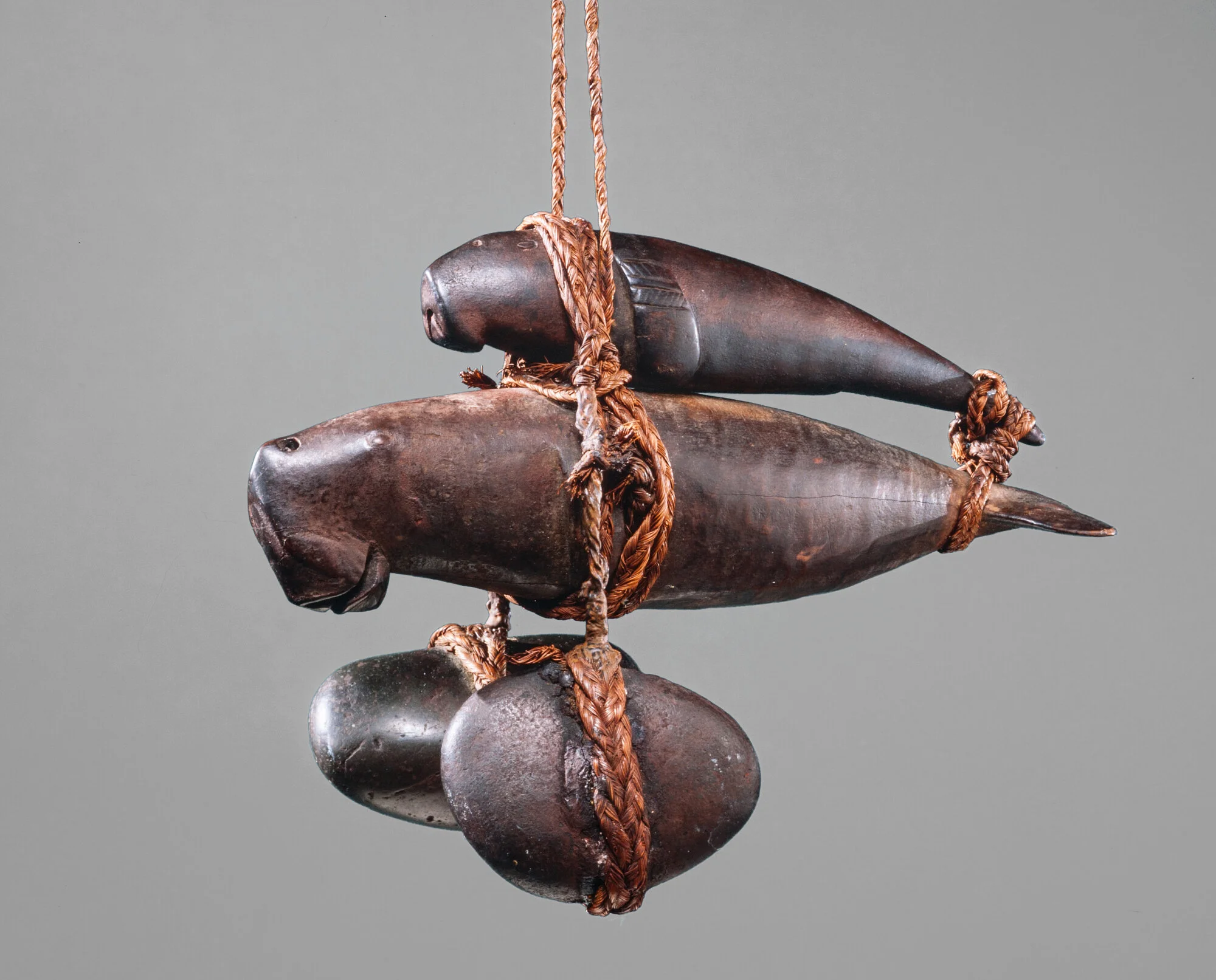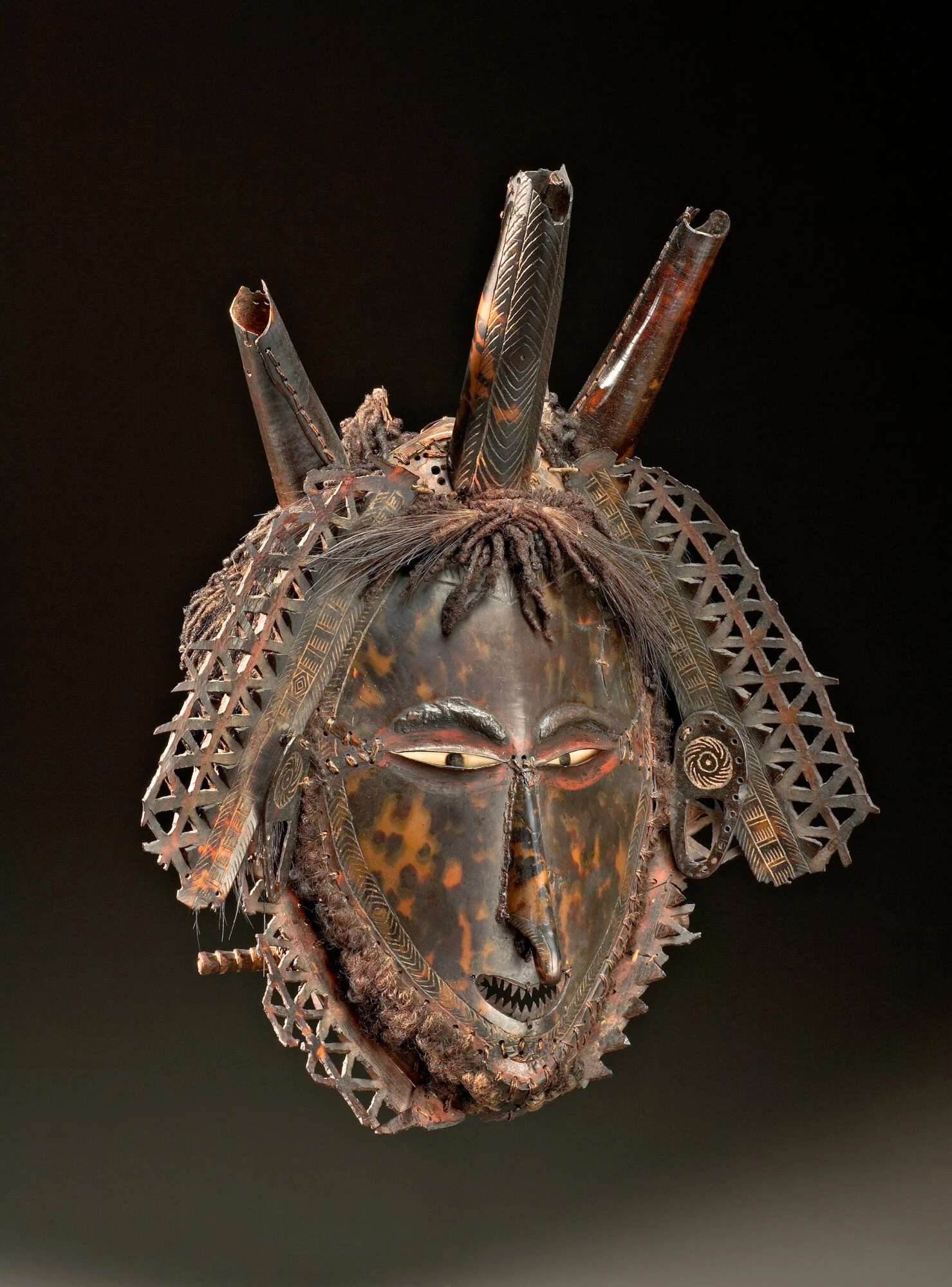 Turtle shell, clamshell, resin, sennit, wood, human hair, and cassowary feathers
