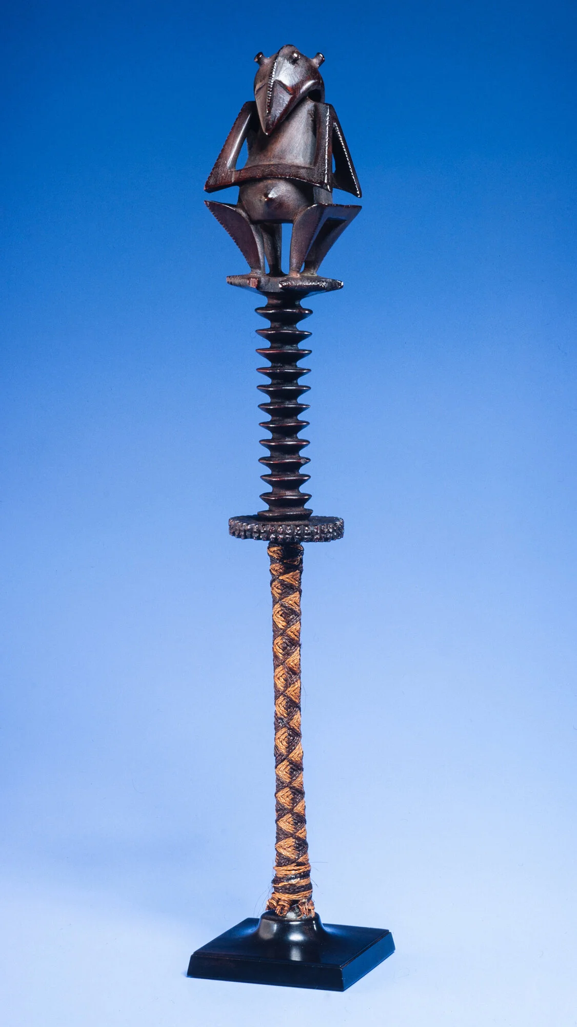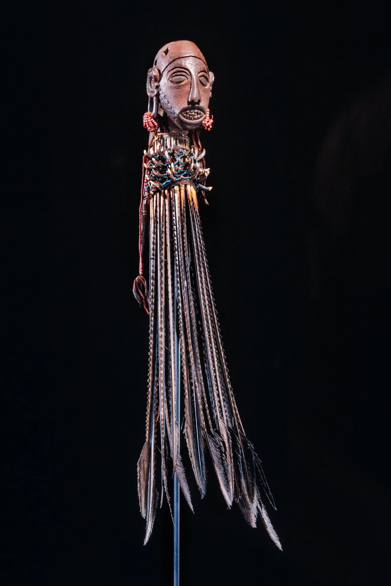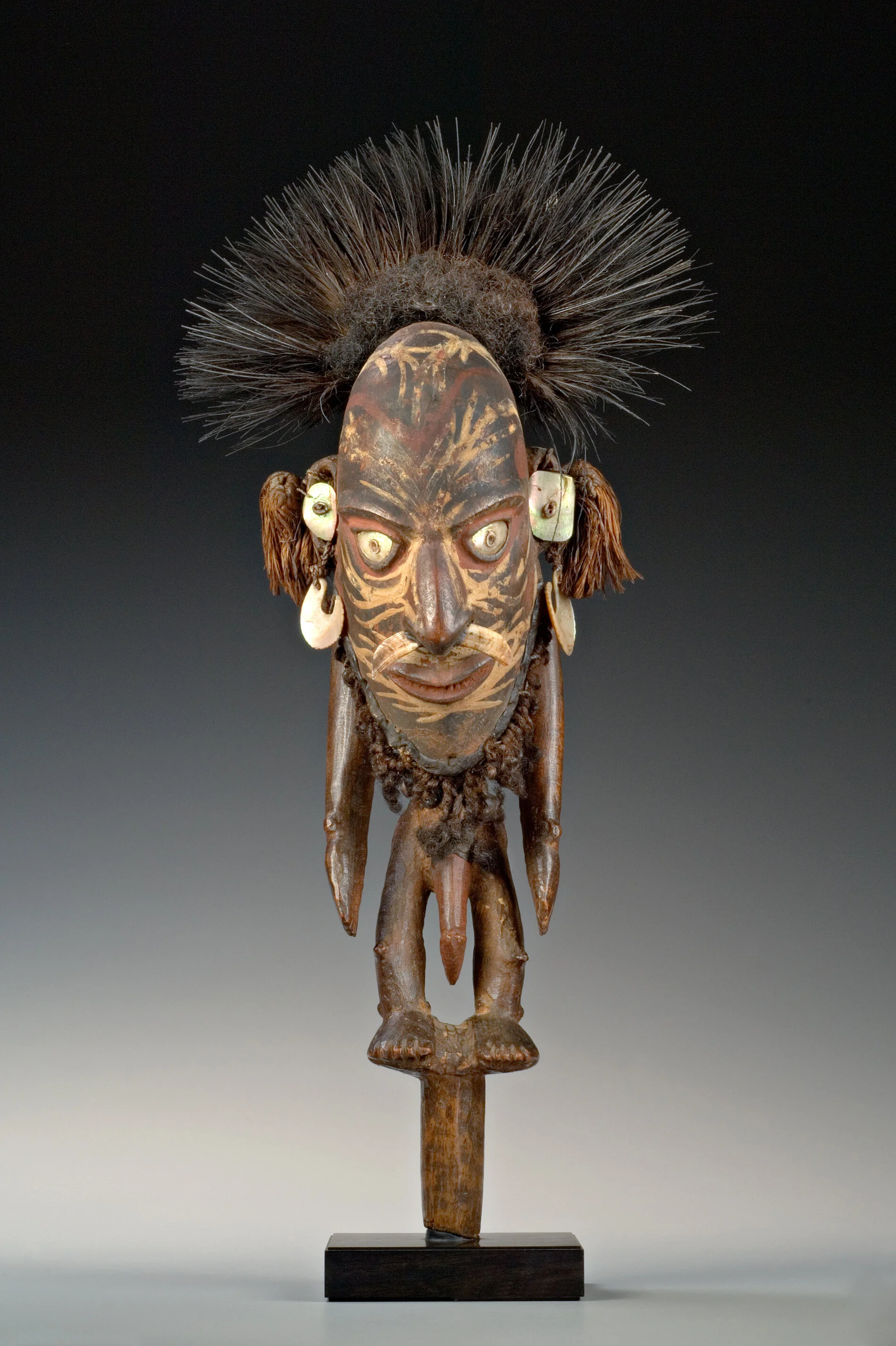 Wood, frigatebird feathers, glass beads, cuscus teeth, cloth, and fiber