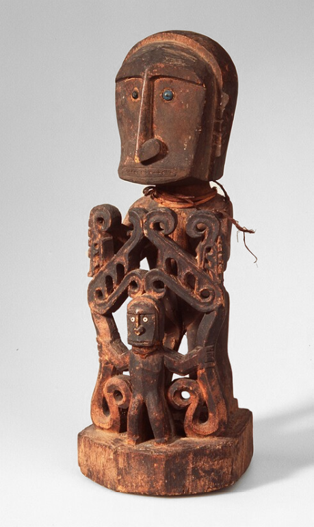Another device that is sometimes embedded in or emerging from this sort of construct is a smaller child-like figure, a mediary or facilitator, that adds yet another layer of spiritual aegis to the entire composition. This can be seen, for example, in the korwars illustrated here from the collections of the Nationaal Museum van Wereldculturen, The British Museum, Yale University Art Gallery, and the Museum Nasional Indonesia.