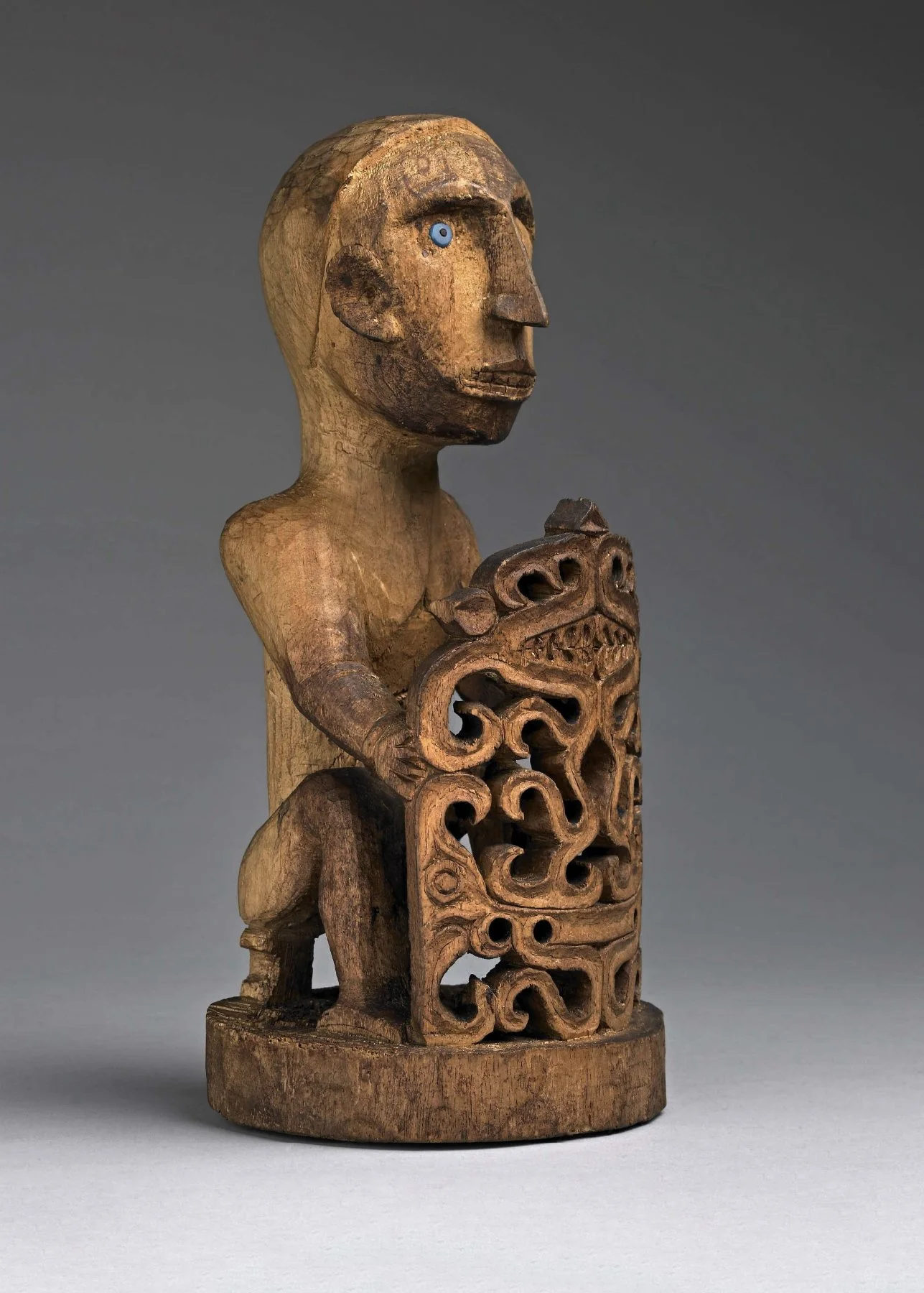 The more complex examples of these statues were carved for persons of importance. Many of these have an intricately carved fence or shield-like structure situated in front of the main figure. This 'shield' or 'balustrade' can be solid and incised or painted, but in the more elaborated korwar, it is carved in an ornate filigree or ajour style of pierced openwork that depicts the sinuous repetition of winding and descending s-curves. While the first korwar in this grouping displays little wear and a fresh surface, it was situated in the British Museum before 1865. This is significant as it shows just what a 19th-century korwar looked like right after it was made. The second korwar also displays little wear or age, but as a variation on a theme, it also tells us what a korwar from the Raja Ampat islands certainly looked like in the 19th century, as this statue was acquired in 1887 or 1888 by F. de Clerq (NMvW).