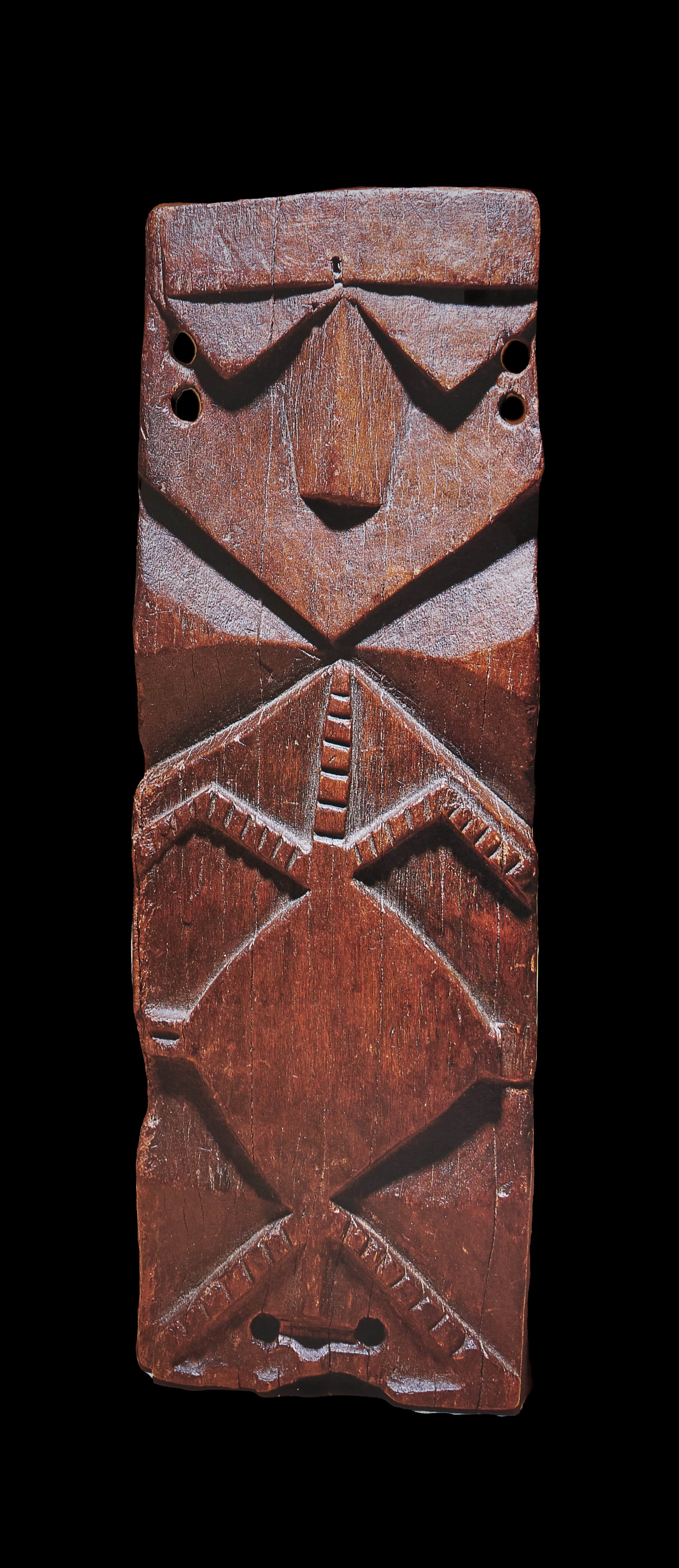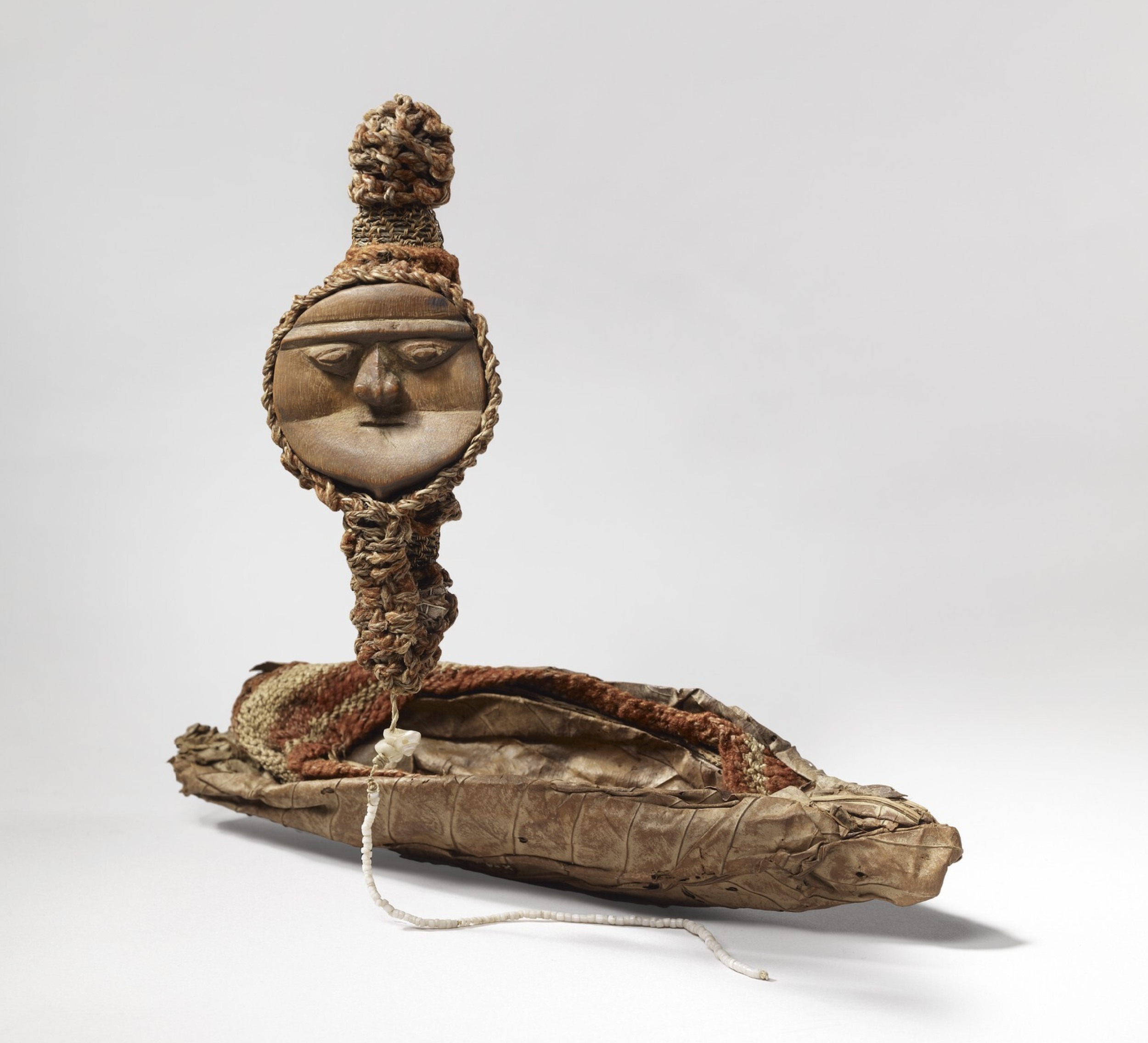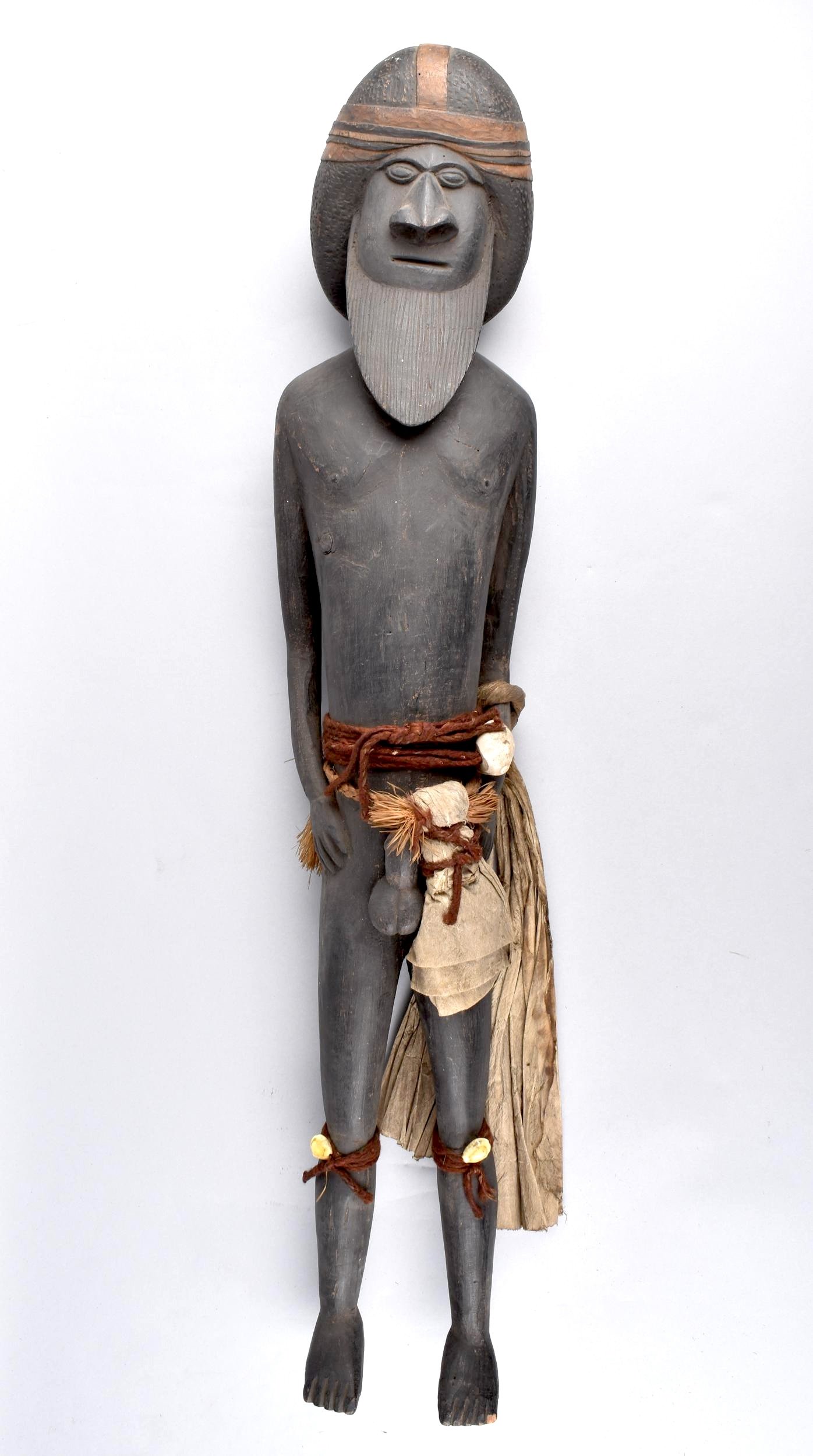 Wood, paper mulberry bark, shells, flying fox fur cord