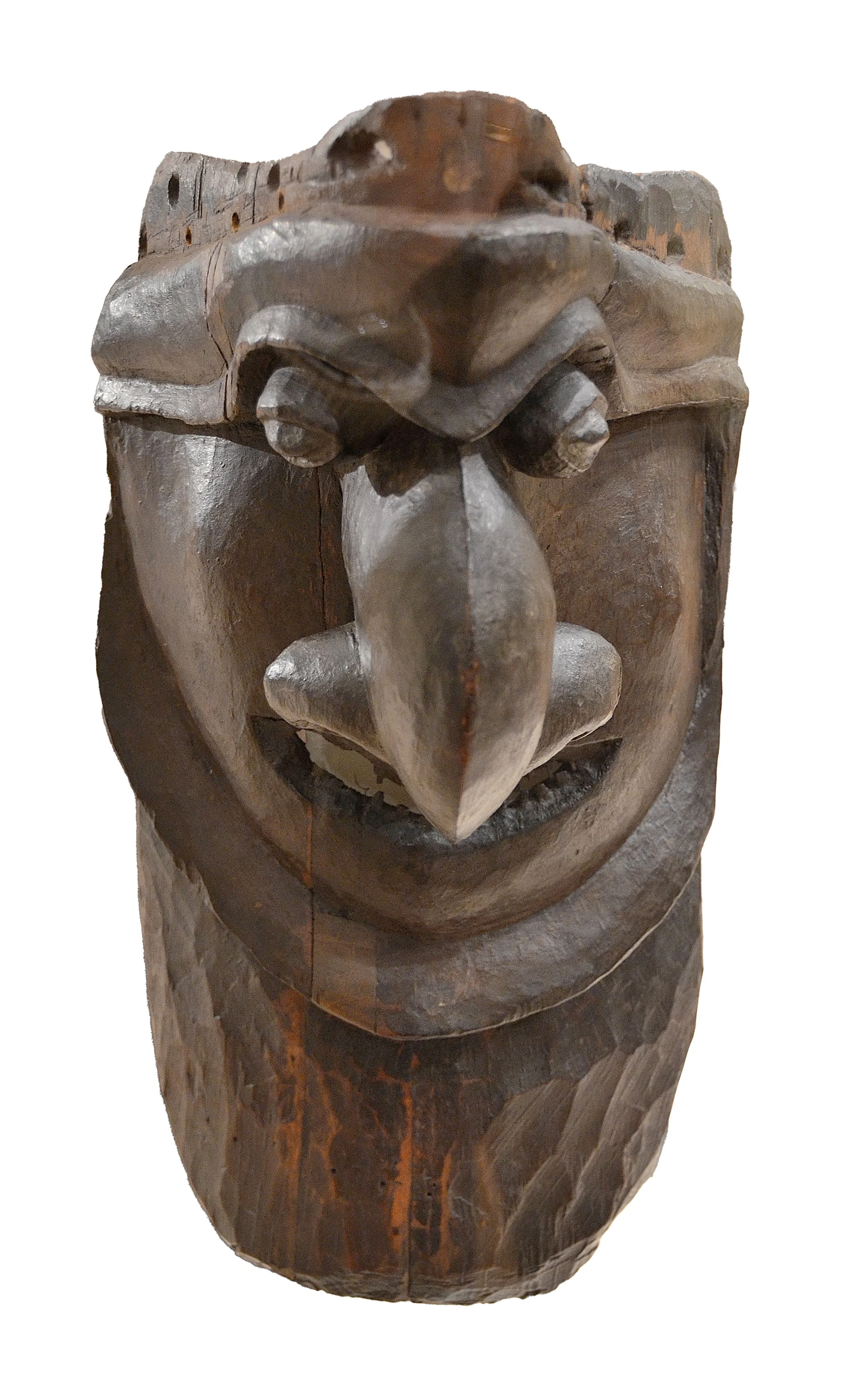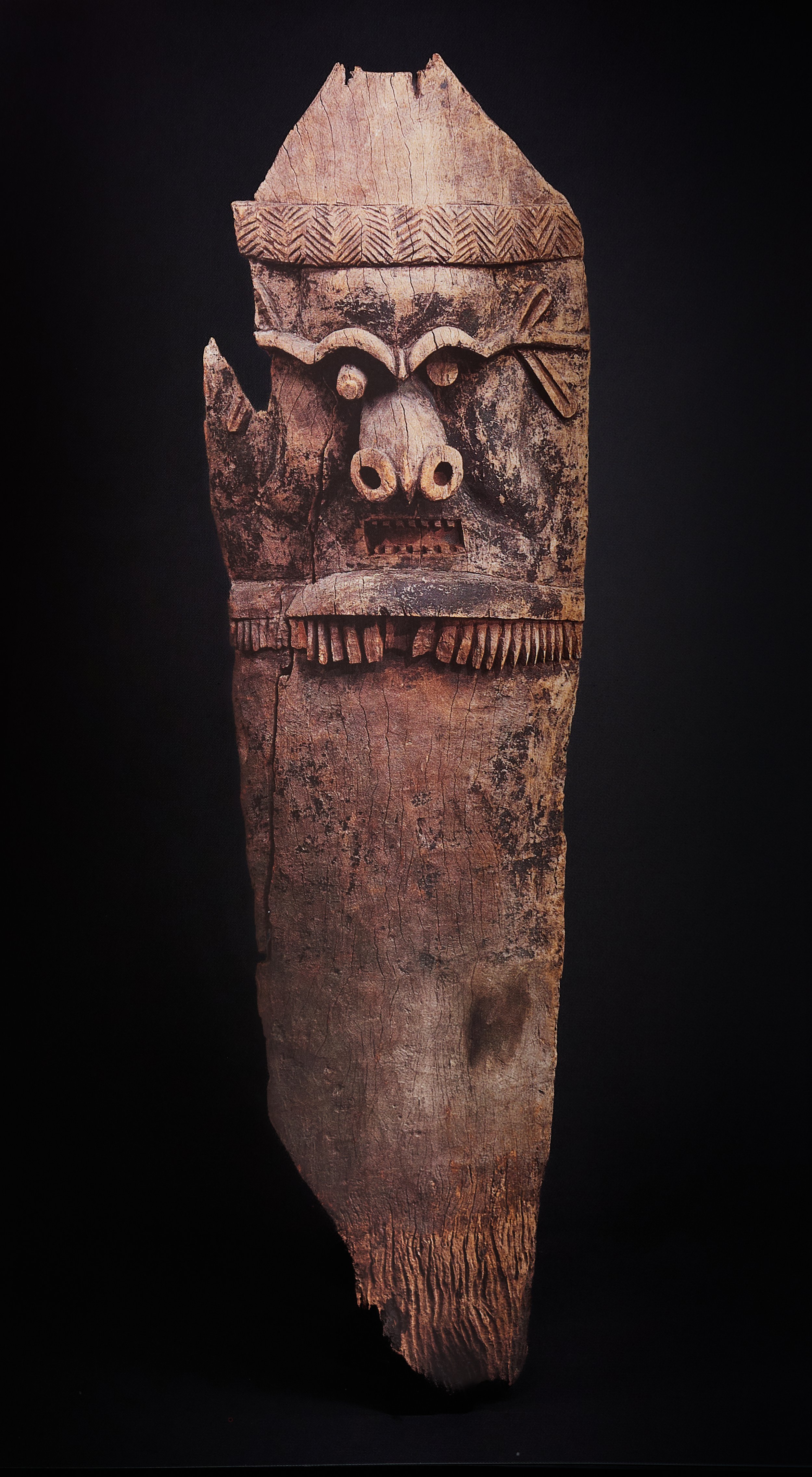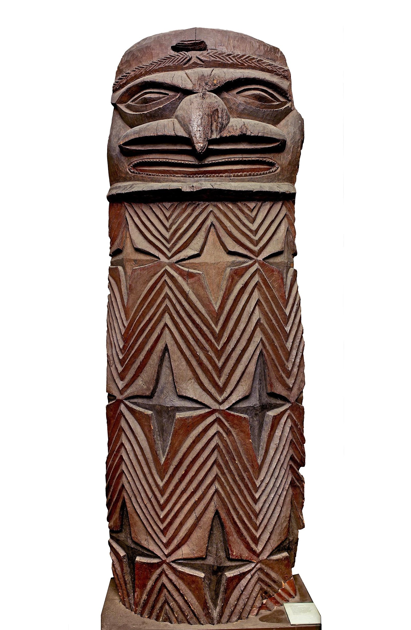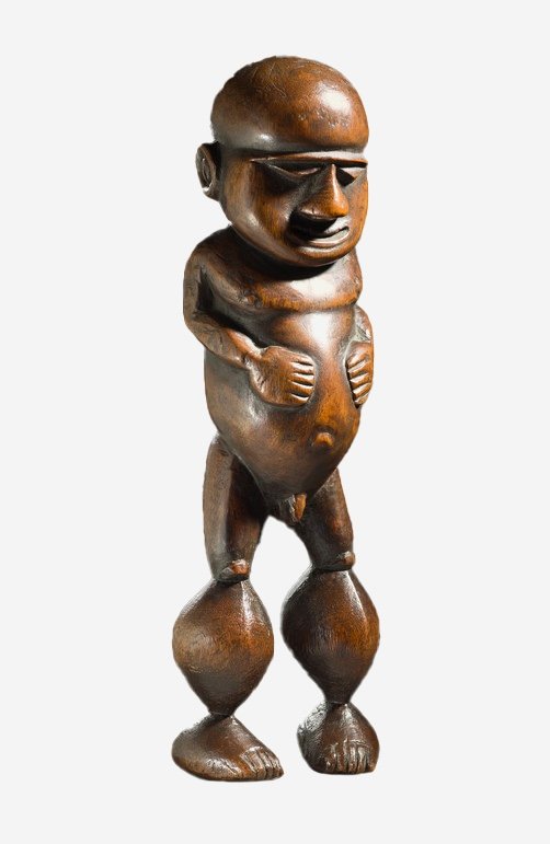 Another class of artifact displaying the carver's art is free-standing figures. These items could be small objects (approximately 5 inches or taller), often wrapped in tapa, herbal material, and flying fox fur. These were then secreted in shrines that were said to confer magical powers and fertility upon their keepers. Figurative images, often associated with ancestors, were kept inside the chief's house, which also served as the village's men's house and communal meeting area. Additionally, large figures were also placed against and in the courtyard of such dwellings. The largest figures (around 6 feet tall) were set atop poles, while smaller free-standing figures might be stashed away or placed in indoor ancestral shrines. The latter often have a rich brown indoor patina and are among the very first wooden items, along with the area's ceremonial clubs and weaponry, that early explorers and mariners brought back to Europe. These were all once part of a complex of ceremonial life, largely designed to pacify the natural environment or the ghosts and spirits of the ancestors, around which all life once revolved.