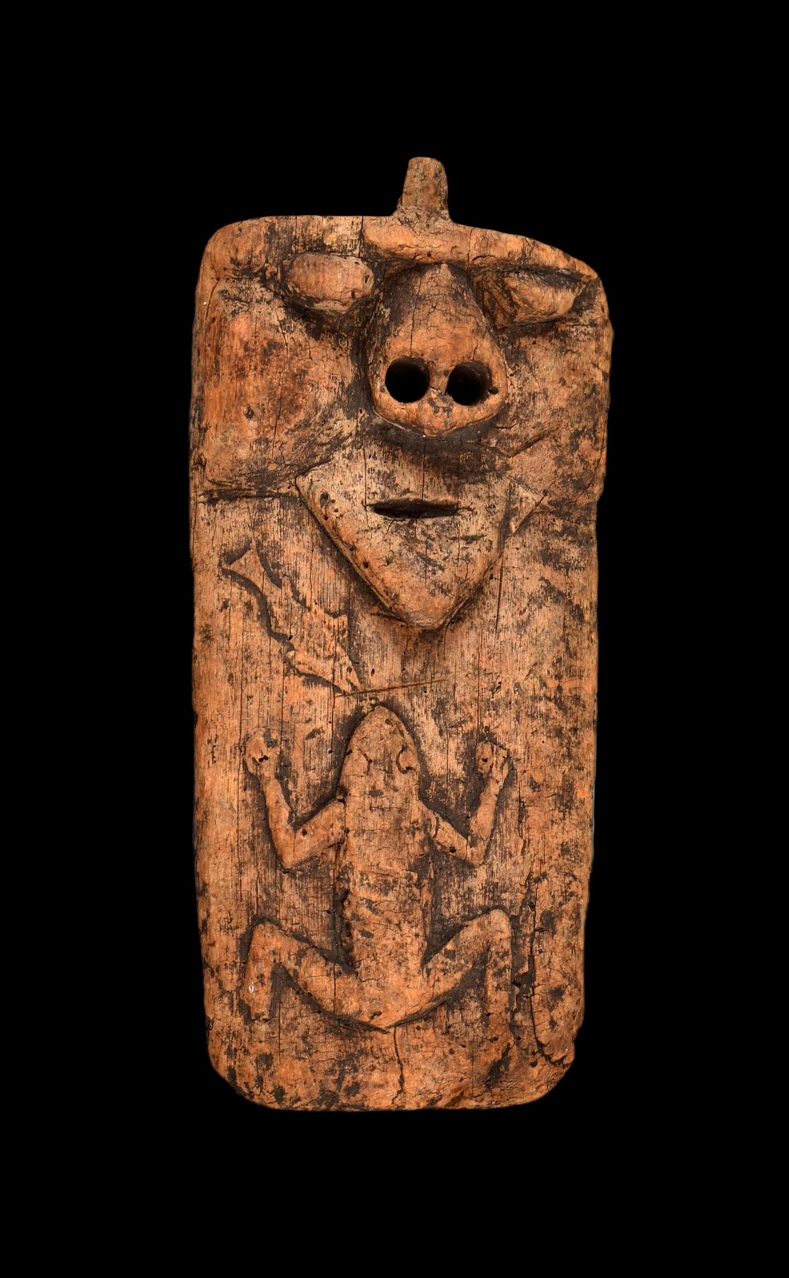 Carved Slab featuring a Human Face, Frog, and Fish