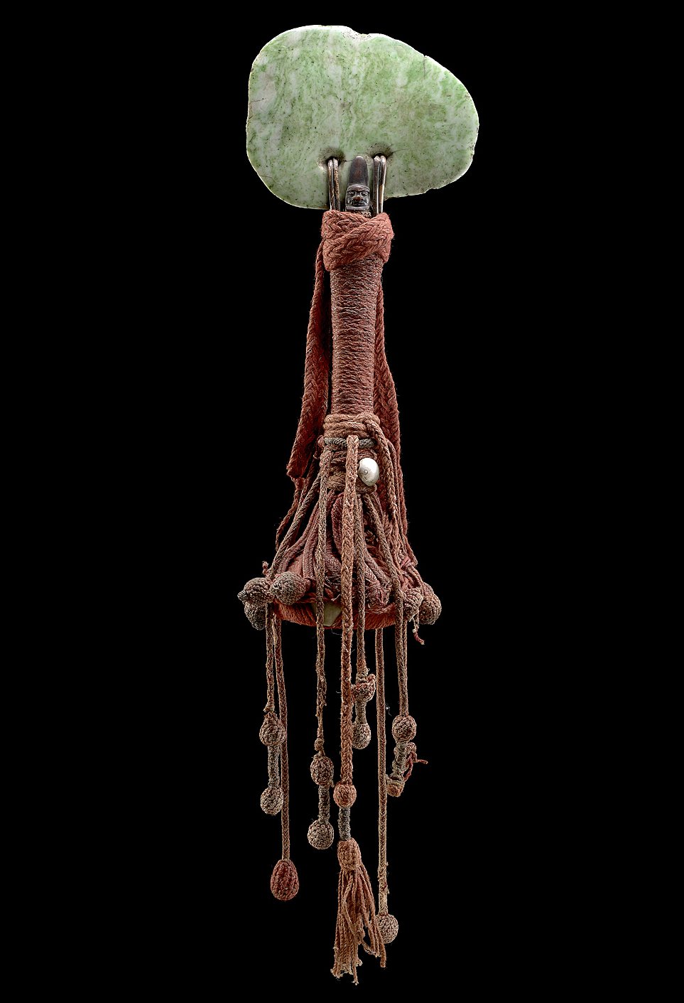Blade made of nephrite, ground, polished, pierced, handle made of wood, covered with textile, wrapped with flying fox wool cords and plant fiber cord, two snail shells