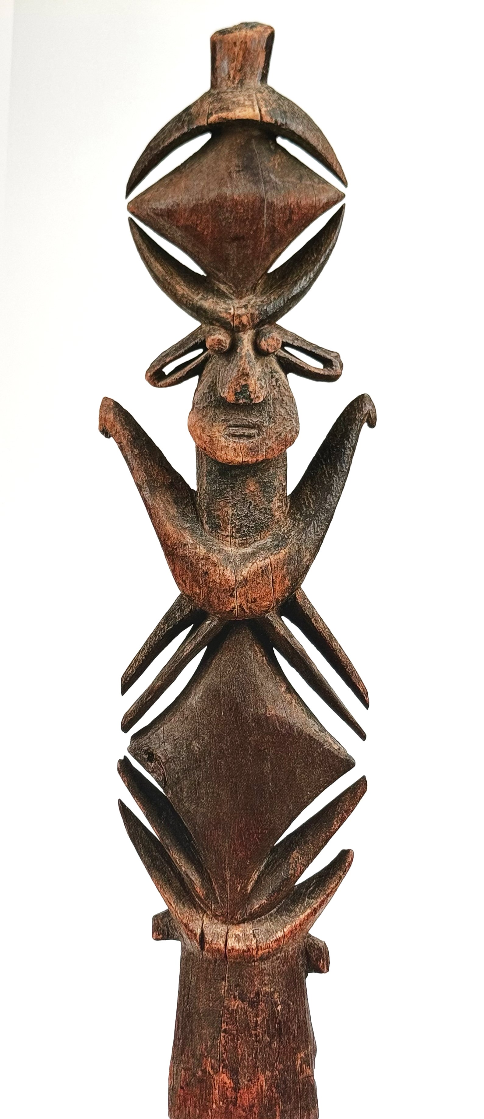 Lastly, the most imposing of all Kanak sculptures are perhaps the roof spires from the great houses of the eldest clan member. Stylistically, these too can vary quite a bit depending on the region where they were created. Named after the wood in which they were carved, i.e., hup in the northern languages of Grand Terre, it refers to the houp tree, which is said to be "the ancestor of all other trees, the one that was there ever since the origins of the clans." (Boulay: 248). Standing tall like beacons, the largest house spires can be approximately 9 to 12 feet tall in total length. They are centered on a crested torso, face, or figure atop a pole that rises from the roof's apex. (See Sarasin: 1912)
