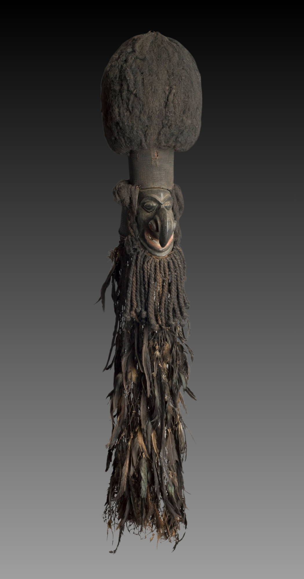 Wood, pigments, feathers, twisted and braided plant fibers, human hair
