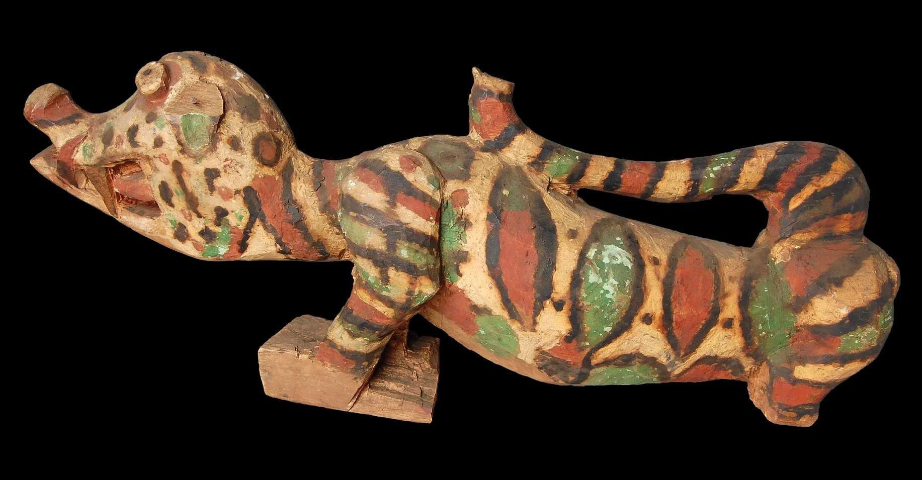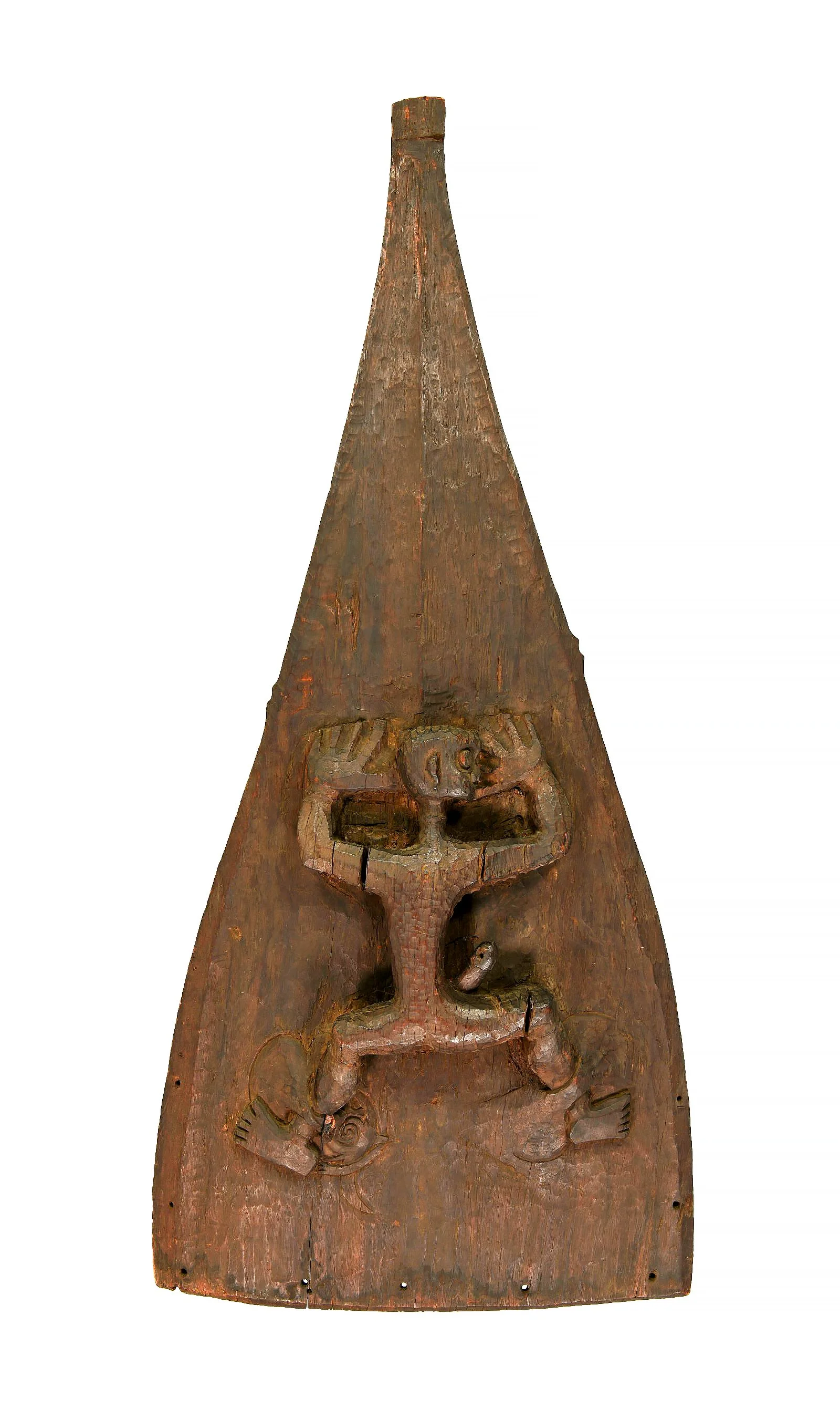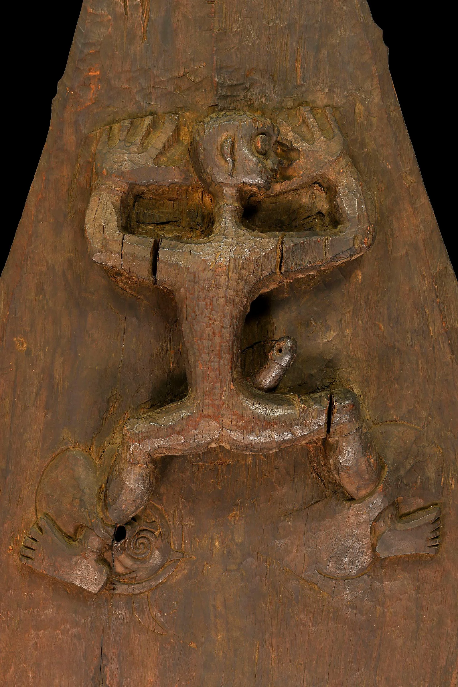 Three ornaments from this area are each distinctive examples of the genre. One depicts a fanged mythical beast with its arms clasped over its head, while another portrays a long-snouted creature with its limbs akimbo. It is also overpainted with a blackened, soot-derived pigment to highlight salient details. One of the great delights in looking at this material was to discover a unique survivor amid prow types. This one is in the form of a large, ornamented bowsprit with a raised, splayed, and well-endowed human figure in rounded high relief. Lastly, a canoe strut ornament used as a spear rest is decorated with two animated creatures: one's gaze is looking off and away, while the other stares directly at its counterpart.