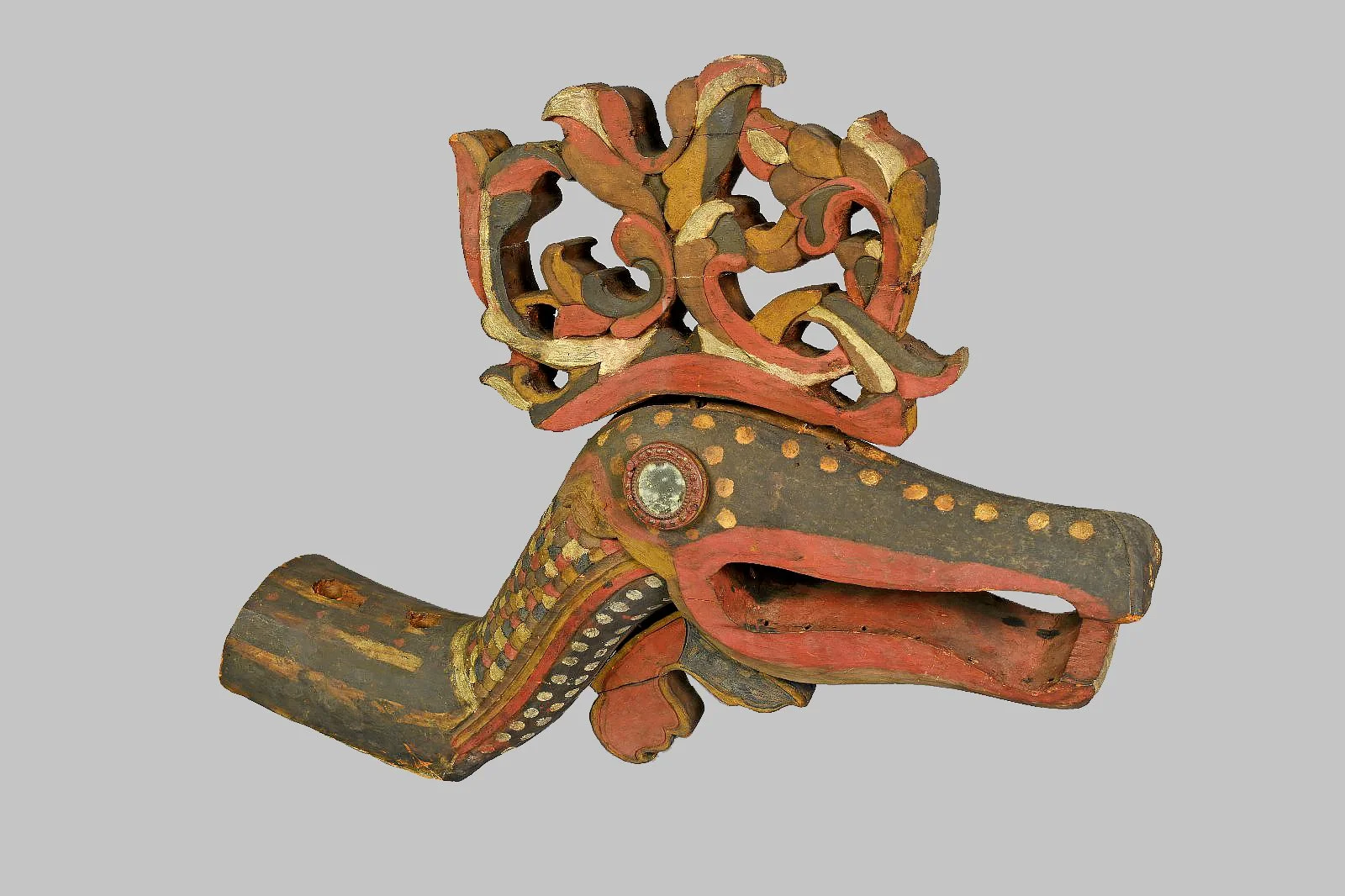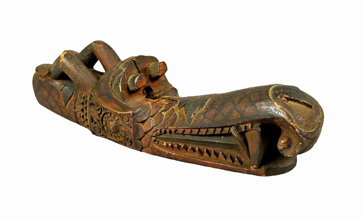 Another figurehead of note is the Kenyah canoe prow ornament (hudo alud) from Cambridge. It appears to fuse elements of a powerful crocodilian form with those of a Chinese qilin and a celestial dragon. Here, a mixture of tradition and imported mediums feature two Chinese porcelain trade bowls that were affixed to create bulging, all-seeing eyes. This prow ornament is from Long Ulai on the Tinjar River. It was collected in situ by Charles Hose, a larger-than-life district officer (under Rajah Charles Brooke, 1884-1904). He is remembered as an able administrator, zoologist, and noted amateur ethnologist who authored several important books. The Pagan Tribes of Borneo (1912) is still regarded as a meaningful contribution to the area's ethnology. Hose also supplied many museums with diverse artifacts, drawing on his many years of observations and expertise. This included selling his largest single collection to the British Museum in 1905. Hose was also directly or indirectly responsible for five of the seven canoe bow ornaments in this feature, including the two illustrated from the British Museum.