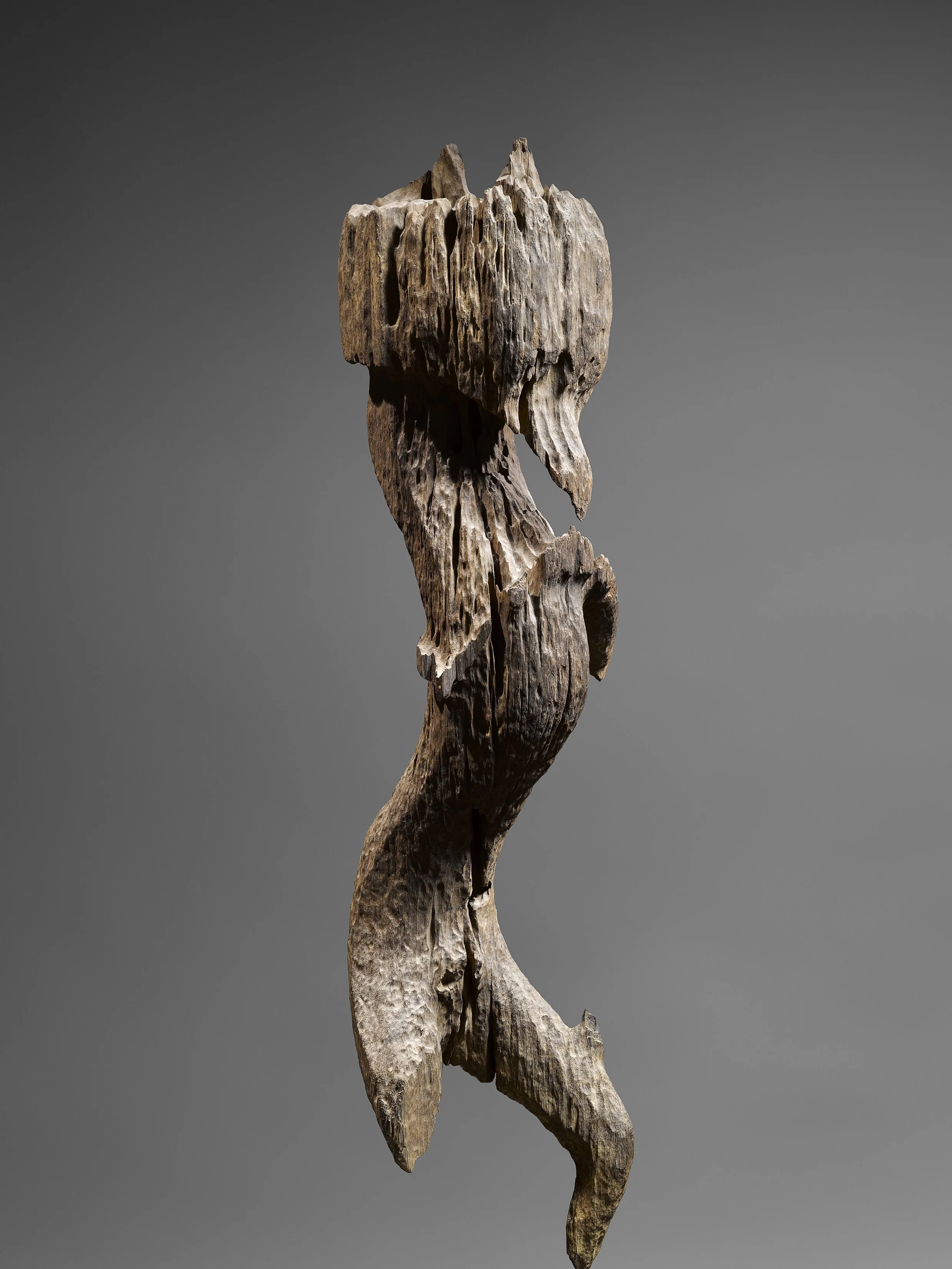 Another item from Borneo that is particularly important is the last major piece that I am personally aware of to be recovered from the muddy banks of the Telen River in East Kalimantan. It is a sinuous archaic anthropomorphic statue. Caressed by the elements: wind, water, and mud, it most likely once adorned an elaborately decorated family sepulcher. (See Bock, The Head-Hunters of Borneo, 1881: color-plates 8 & 9) It is also likely related to a tutelary figure in the Dallas Museum of Art (Eyes of the Ancestors: Second edition, Tuttle, pages 134-135) that was once clearly affixed to a similar structure.
