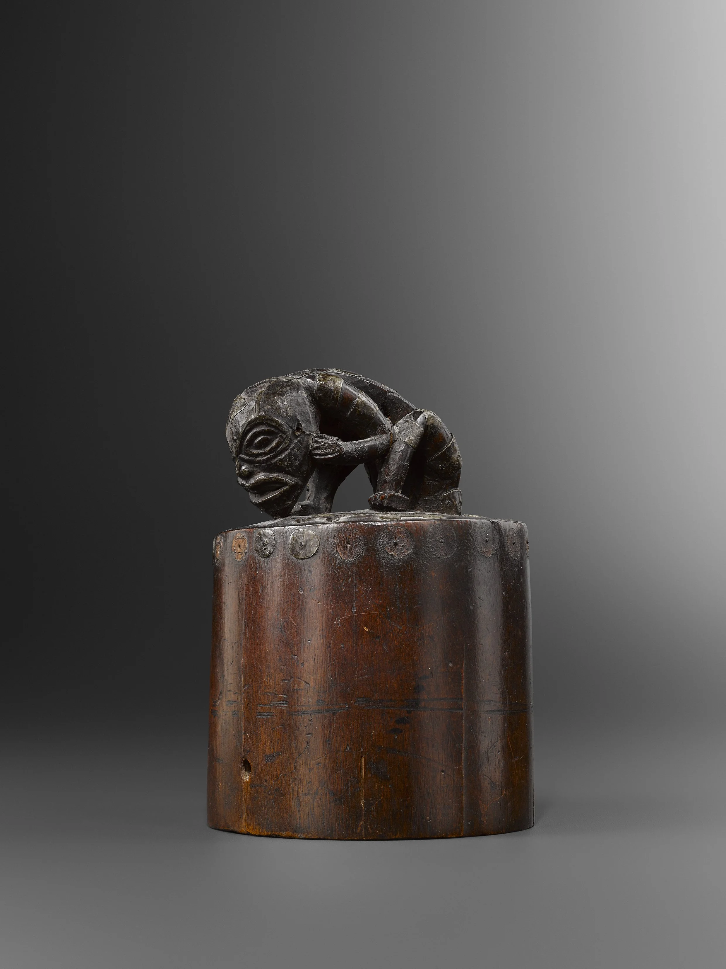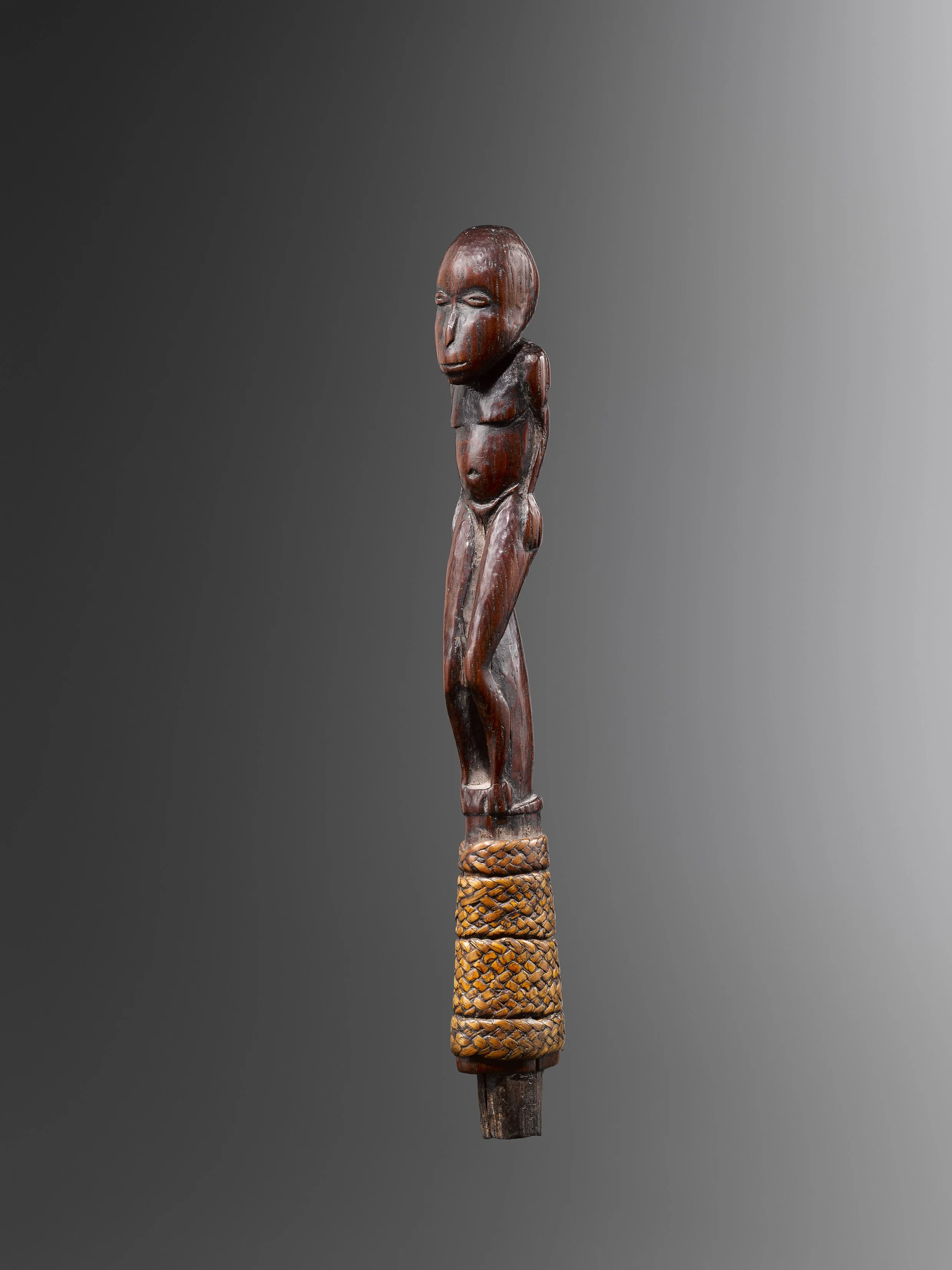From one of the region's most diverse art-producing islands, Borneo, three stellar items from Kalimantan are illustrated below. The first two are the product of the Bahau Saa' people of the Middle Mahakam river basin, whose distinctive carving style assuredly blends Modang and Kayan elements into their own inherited traditions. Their artistry is readily recognizable in a few surviving chiefly seats, inner house panels, hardwood baby carriers (katung), and the carved struts that were used to stabilize woven rattan baby carriers. The Bahau Saa' version of wide-eyed squatting heart-shaped faced protective figures is iconic. With their compact muscularity, these figures exude raw torque, a compressed force that is indeed equaled by the carving's elegance and technical execution. Such a blend of conventions is only encountered amidst a few and quite diverse traditional world art traditions. The finest Bahau and Modang creations invite favorable comparisons when appreciated alongside the sculptural traditions of the Fang, Taino, or Hawaiian peoples.